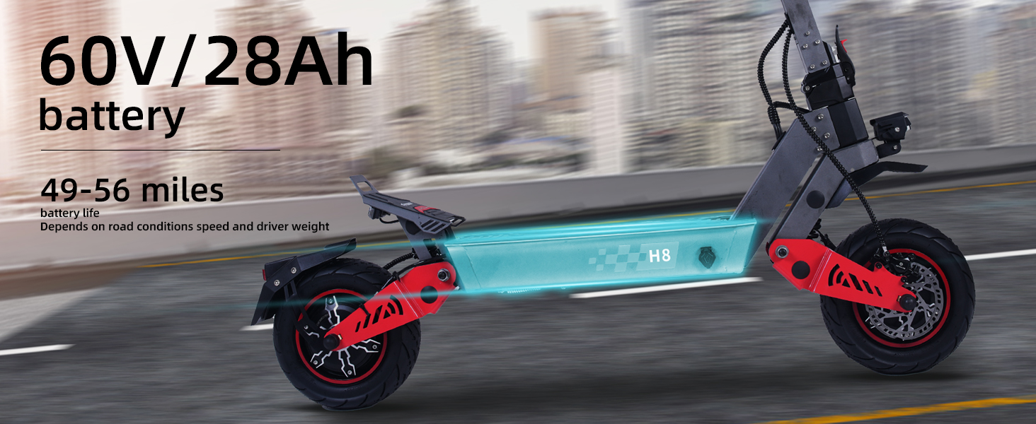✅6000W Dual Motor & 60V 28Ah Battery: Two 3000W motors + big battery offer power and up to 90km range.